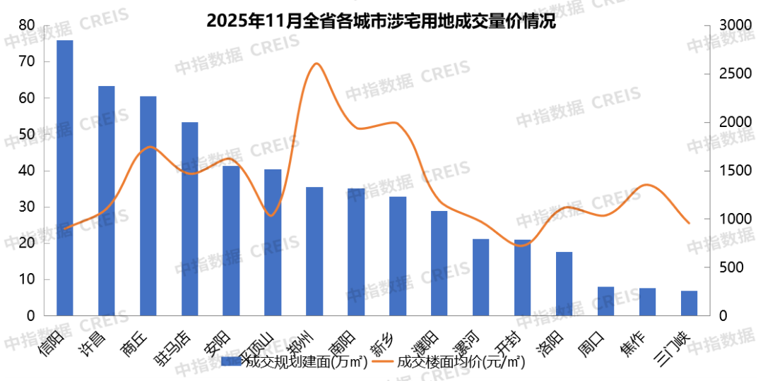 分城市来看,11月共16个城市有住宅用地成交,成交规模(按规划建筑面积计算)前三城市中,信仰市共成交8宗住宅用地,规划建筑面积合计75.87万平米,成交规模位居全省第一;其次是许昌市,成交9宗住宅用地,规划建筑面积合计63.41万平米;商丘市位列第三,成交9宗住宅用地,规划建筑面积合计60.48万平米。成交楼面均价方面,郑州市以2598元/㎡的价格位居全省首位;新乡市以1986元/㎡位居第二;南阳市以1944元/㎡位居第三。
