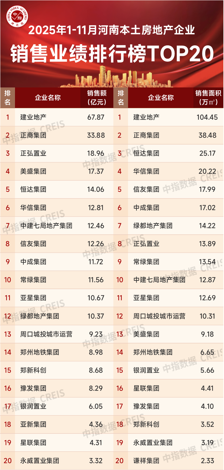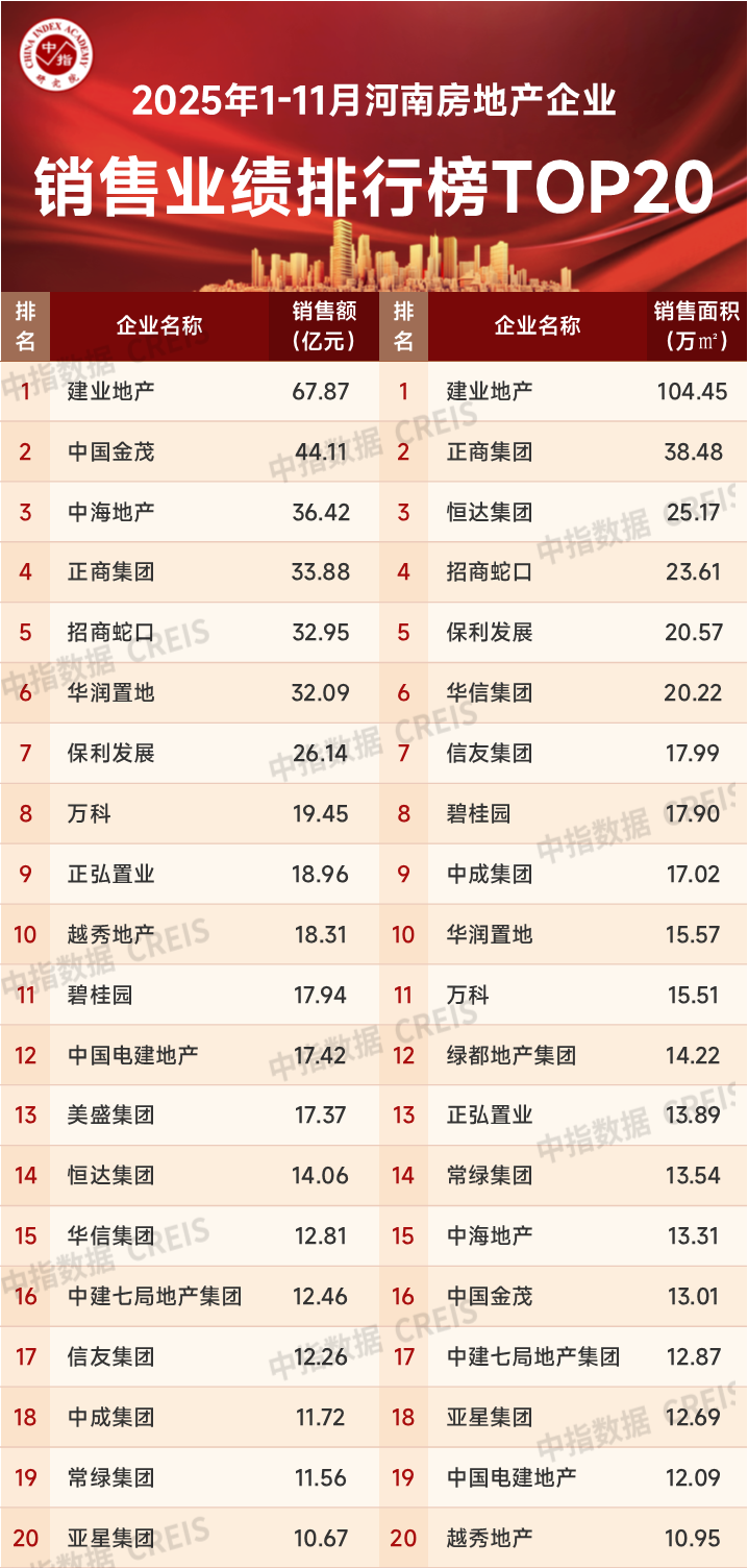 11月,河南省房地产市场总体延续低温运行态势,洛阳、驻马店等地优化公积金贷款政策以支持住房消费,郑州核心地段品质项目开盘热销,土地市场核心区域优质地块仍受房企青睐,改善型需求主导市场的格局持续凸显。在此背景下,河南房企在2025年1-11月的销售业绩究竟如何?一起看一下数据表现: