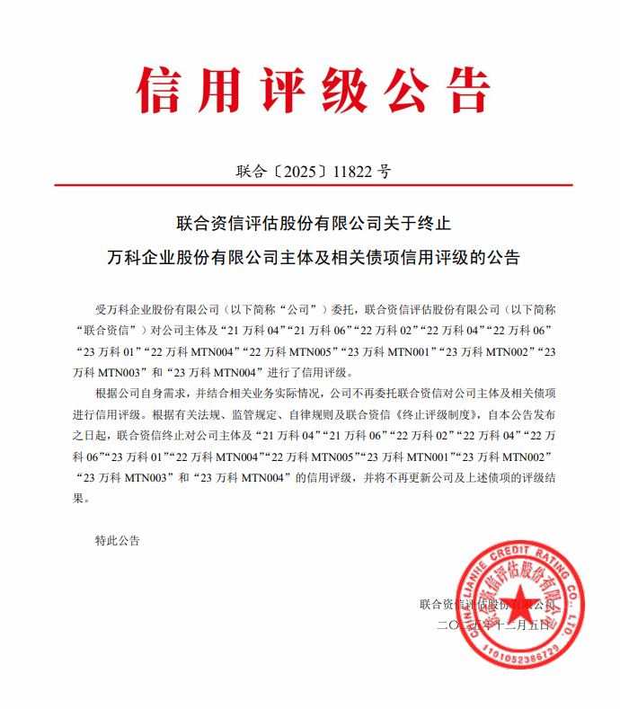 同日,万科A公告称,根据公司自身需求,并结合相关业务实际情况,公司不再委托联合资信对公司主体及相关债项进行信用评级。根据有关法规、监管规定、自律规则及联合资信《终止评级制度》,自本公告发布之日起,联合资信终止对公司主体及“21万科04”“21万科06”“22万科02”“22万科04”“22万科06”“23万科01”“22万科MTN004”“22万科MTN005”“23万科MTN001”“23万科MTN002”“23万科MTN003”和“23万科MTN004”的信用评级,并将不再更新公司及上述债项的评级结果。